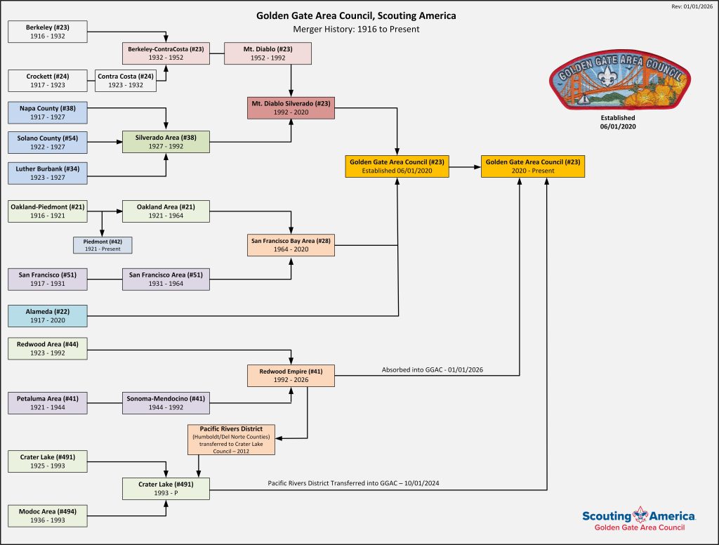 In October 2024 the Pacific Rivers district (Humboldt & Del Norte Counties) of the Crater Lake Council was transferred to the Golden Gate Area Council territory as the demographics of the Crater Lake Council in Oregon maintaining a California district did not make sense. Then in mid 2025 is was announced that the Redwood Empire Council (Sonoma and Mendocino Counties) would be absorbed into the Golden Gate Area Council.